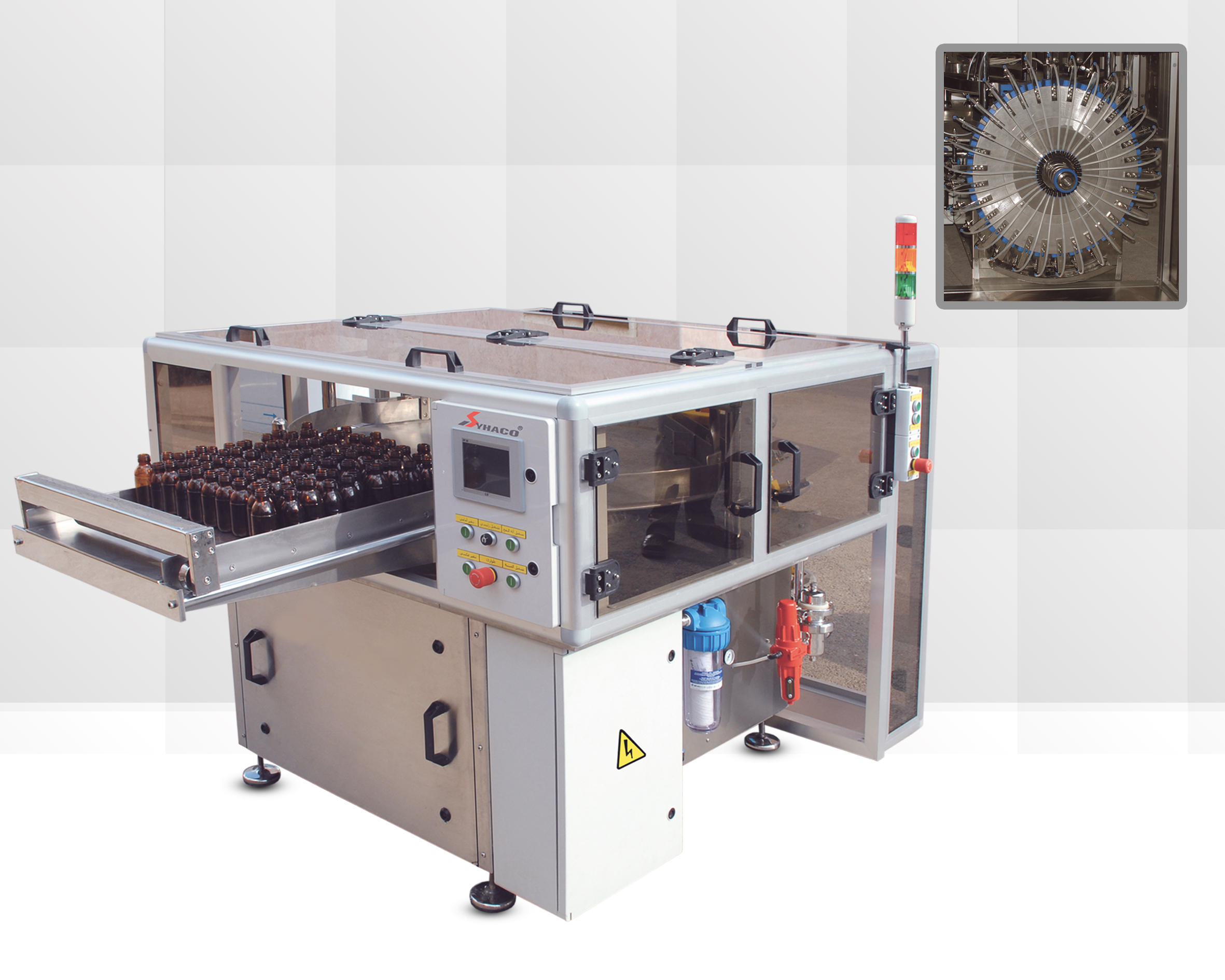 يتم تلقيم العبوات على الطاولة الدوارة و بعدها تتجه العبوات الى ماكينة النفخ المدمجة بماكينة التعبئة